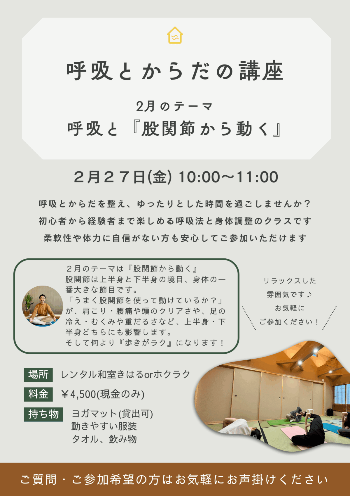 ※お問い合わせフォームからの場合、メニューは「呼吸法レッスン」を選択し、備考欄に「2月呼吸とからだの講座参加希望」とご記入ください。